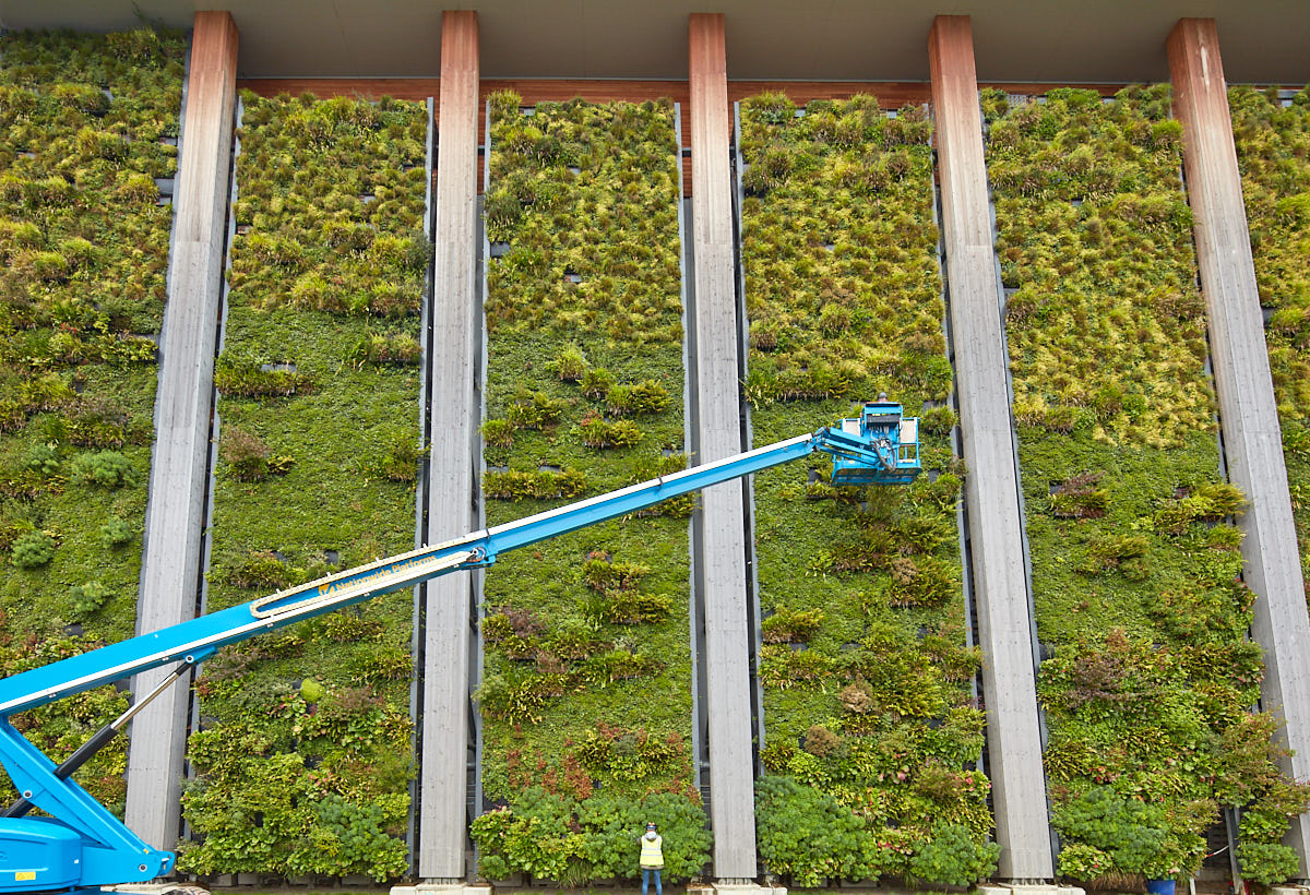 The living wall’s varied structure, including small trees and shrubs, delivers seasonal interest and ecological value.