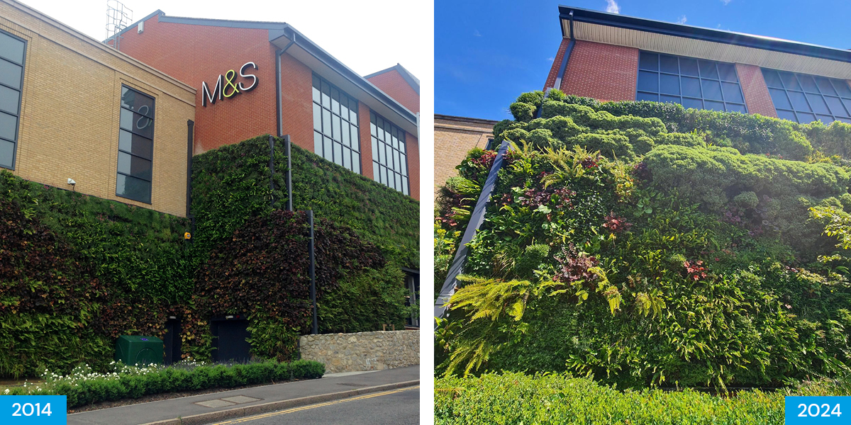 The living walls at M&S’s Sevenoaks store were installed as part of a long-term plan to make M&S stores greener and more sustainable. The green walls maintain their lush cover all year round, and native plant species were chosen to boost biodiversity.