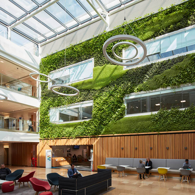 The living wall is positioned under a large, glazed skylight that offers the plants the full spectrum of sunlight, with sun-loving species placed closer to the light and plants requiring more shade towards the bottom.